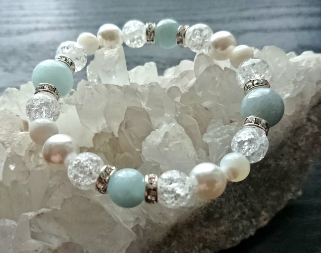 【使用天然石】 ・アクアマリン ・淡水パール ・クラック水晶 【サイズ】 ・15cm~(変更可能) 【商品に関する説明】 ・オペロンゴム3本重ねで作成しています。 ・天然石を使用しています。 ・本商品はPureMatiereオリジナルの デザインブレスレットになっております。 【注意点】 ・天然石を使用している為、色の個体差、傷や凹みなどがある場合があります。 作成時に厳正した石を使用していますので、一点物の個性とご愛嬌くださると幸いです。 ・ご覧いただいているPCやスマートフォン・タブレット端末の画面によってブレスレットの色合いが誤差が多少あります。 【ワイヤーブレスレットに関して】 本ブレスレットのワイヤーブレスレットは 0,5mmのワイヤーの一本引きと 0,45mmのワイヤーの二本引きの いずれかで作成しています。 【ゴムブレスレットに関して】 本ブレスレットのゴムブレスレットは 0.5mmのオペロンゴムを重ねたもので作成しています。 ゴム色は天然石本来の色合いを引き立てる乳白色で統一しています。 その他、ご質問等ございましたら 遠慮なくご連絡下さい。