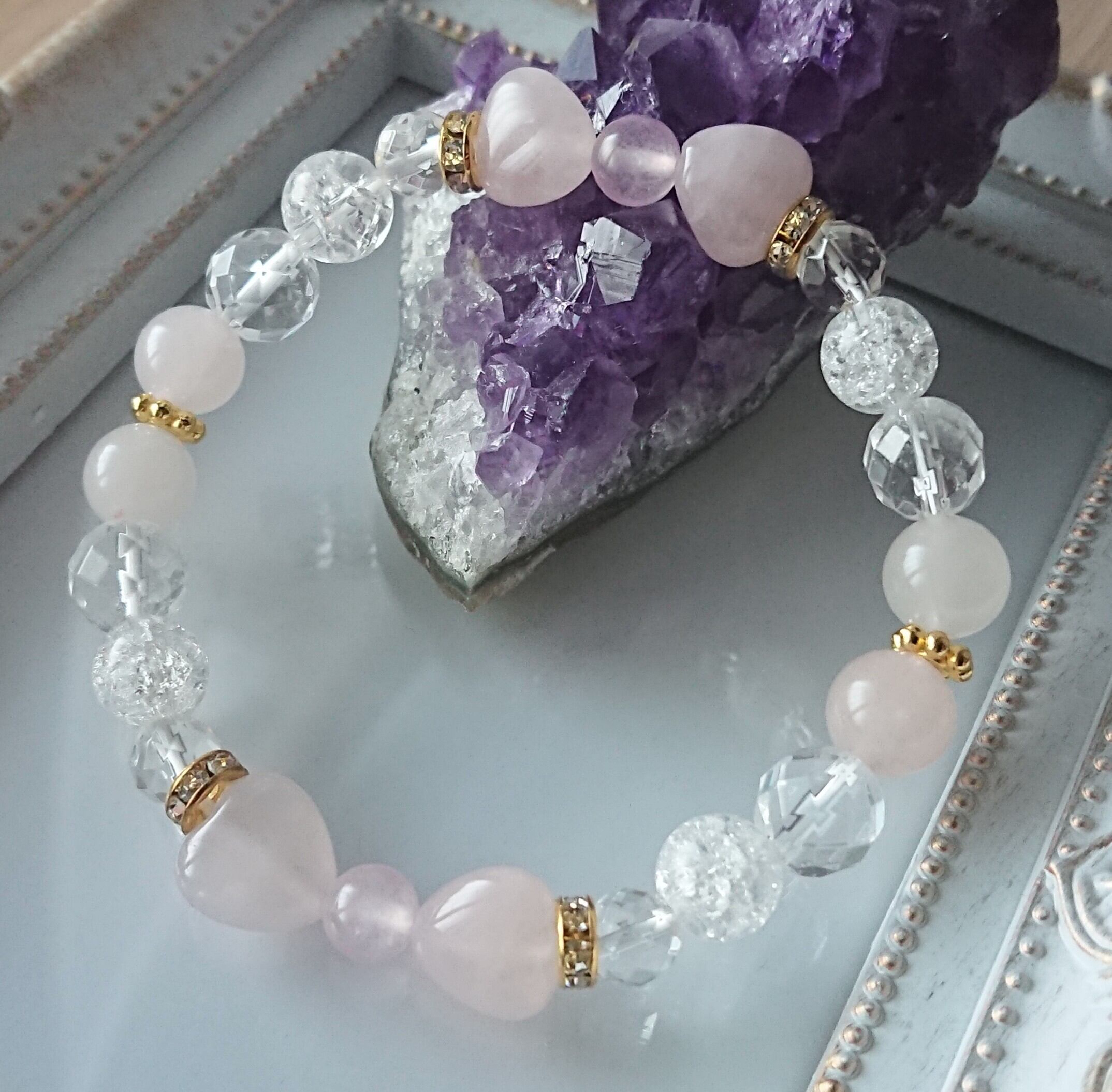 リボンブレスレット 16cm【ローズクォーツ×水晶】